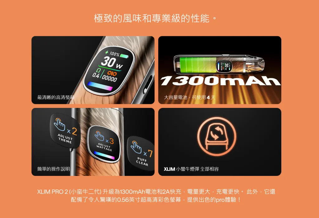 A1: 完全可以。OXVA Xlim Pro II 2 Pod 小蠻牛二代 小煙主機完美相容OXVA XLIM系列的煙彈(V2, V3, Top-Fill款式),包括0.4Ω, 0.6Ω, 0.8Ω, 1.2Ω等規格,舊用戶可無縫升級。 - Q2: 1300mAh電池實際可以使用多久?